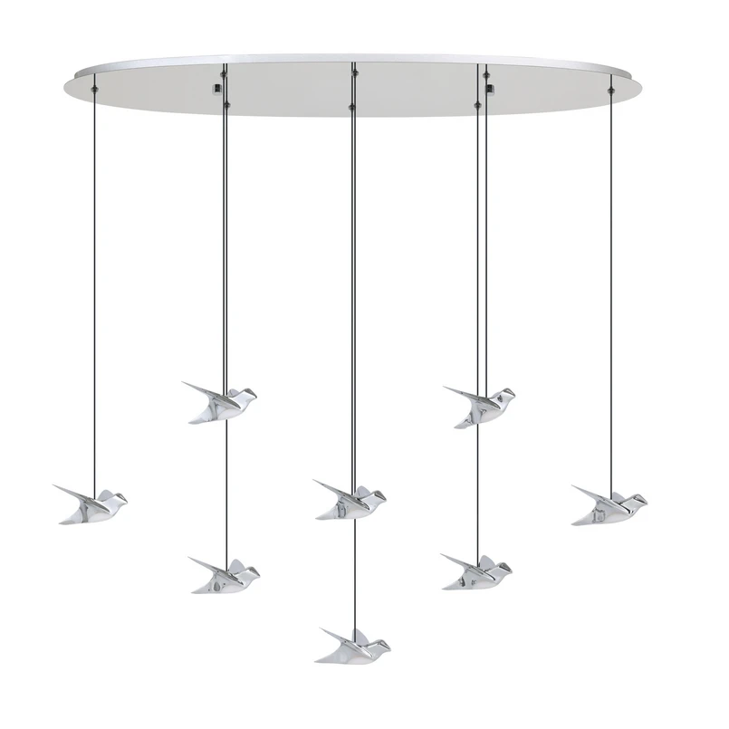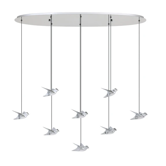 La lampada LED a sospensione Paratebueno attira l'attenzione in ogni ambiente grazie al suo design particolare. Da un rosone ovale pendono 8 uccelli in metallo che sembrano svolazzare. Questo design ricorda un mobile. Nel ventre di ogni uccellino è inserito un elemento luminoso a LED bianco caldo che diffonde la luce verso il basso in modo efficace e uniforme.