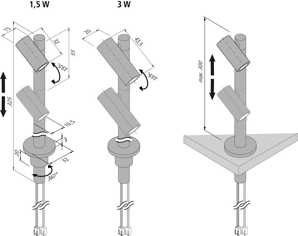 Faretto altamente funzionale per Innes: LED Mono Spot - 1,5 watt Questo faretto LED per interni è indispensabile grazie alle sue numerose funzioni, sia per illuminare una vetrina che per evidenziare sapientemente aree speciali. L'estremità inferiore dell'asta della struttura si installa semplicemente nella base della vetrina, ad esempio, e il cavo di collegamento con spina LED 24 è già incluso. Il trasformatore necessario può essere ordinato come accessorio. L'altezza dell'asta può essere regolata fino a 30 cm e la testa della lampada non solo può essere ruotata di 360 gradi, ma anche orientata di 300 gradi, rendendo le opzioni di illuminazione molto flessibili. L'angolo del fascio luminoso è di 38°. Un faretto LED che può essere utilizzato in vari modi in aree private e commerciali.