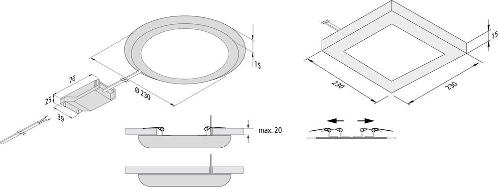 FR 65/205 Plafoniera a LED per montaggio in superficie o a incasso, dimmerabile La plafoniera rotonda FR 65/205 può essere utilizzata come plafoniera, ma può anche essere incassata nel soffitto. Si adatta in modo molto flessibile a fori da 6,5 a 20,5 cm e a pannelli del soffitto con uno spessore massimo di 2 cm grazie alla molla di montaggio regolabile. La plafoniera è dotata di un terminale di collegamento per l'allacciamento diretto a 230 Jannes e di un cablaggio passante integrato, in modo da poter essere facilmente cablata per illuminare aree più ampie in fila ed è molto facile da installare. La plafoniera FR 65/205 è quindi particolarmente indicata per l'illuminazione di lunghi corridoi con controsoffitti. I LED ad alta efficienza energetica dietro la copertura satinata forniscono un'illuminazione uniforme senza punti luce visibili e possono anche essere dimmerati utilizzando un dimmer di fase nell'installazione dell'edificio (non incluso).