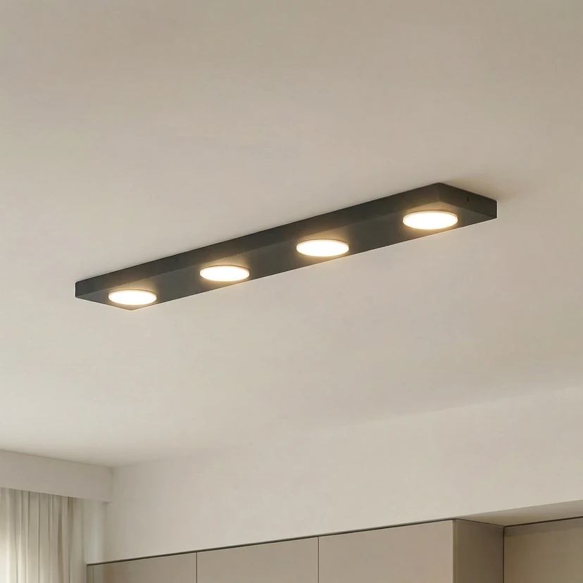 La plafoniera Hero convince per il suo design moderno e la lavorazione di alta qualità in robusto acciaio. Con la sua elegante colorazione nera, si adatta a diversi ambienti della casa come corridoio, cucina o soggiorno e dona un tocco di stile. Le quattro fonti luminose garantiscono un'illuminazione uniforme e creano un'atmosfera piacevole.